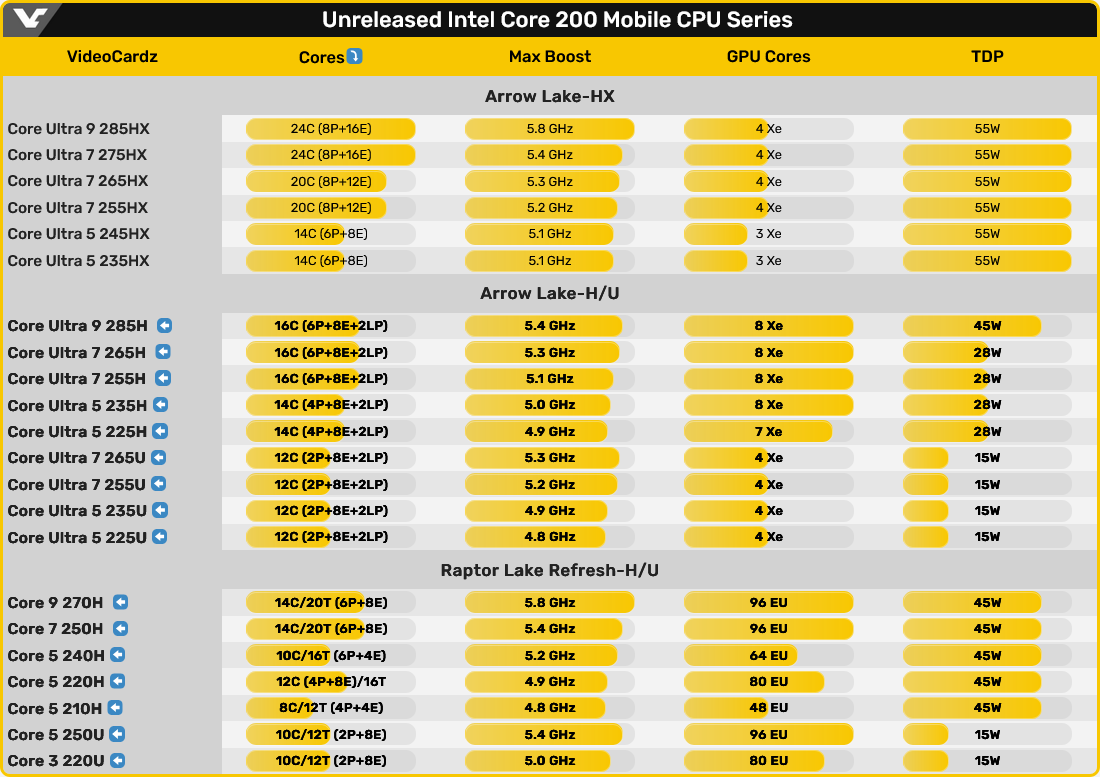 Arrow Lake-HX 爱好者移动版:Core Ultra 200HX (200HX)