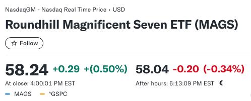 特斯拉、谷歌、亚马逊和苹果都在周一创下了历史新高。即便是在周二,三大股指普遍下跌的情况下,追踪这七大公司的Roundhill Magnificent Seven ETF(MAGS)依然达到了新高。