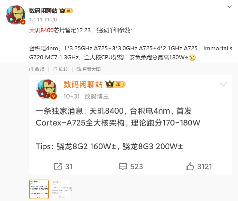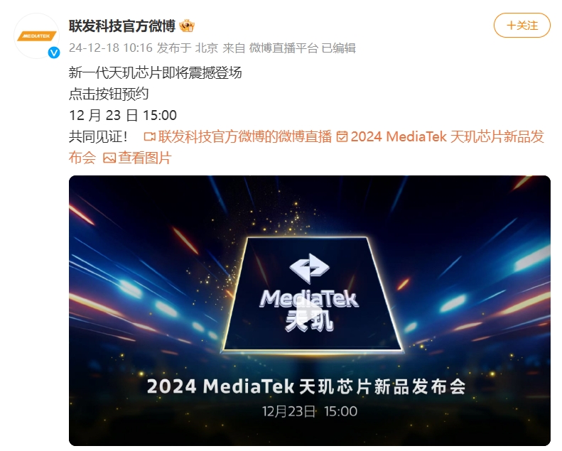 12月18日,联发科在官方微博正式宣布,2024联发科天玑芯片新品发布会定档12月23日15:00。根据惯例及数码博主爆料,联发科将在此次发布会上,带来定位中高端的最新移动端处理器天玑8400,助力中高端智能手机性能、体验大幅提升!