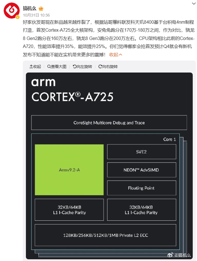 “全大核”架构可以在不牺牲DoU(日常使用时间)价值的情况下提供更高的多线程性能,软件会自动管理任务分配到适当的CPU内核。操作系统直接了解系统中的高性能和高能效内核,并可以根据所需的性能动态分配每个任务。得益于此,天玑8400的性能、能效将得到大幅提升。据数码博主@搞机么 的爆料显示,天玑8400 CPU架构相比此前的Cortex-A720,性能提升35%,能效提升25%。