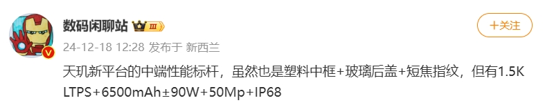 @数码闲聊站 最新爆料称,REDMI新机采用天玑新平台的中端性能标杆,虽然也是塑料中框+玻璃后盖+短焦指纹,但有1.5K LTPS+6500mAh±90W+50Mp+IP68,与此前爆料几乎一致。