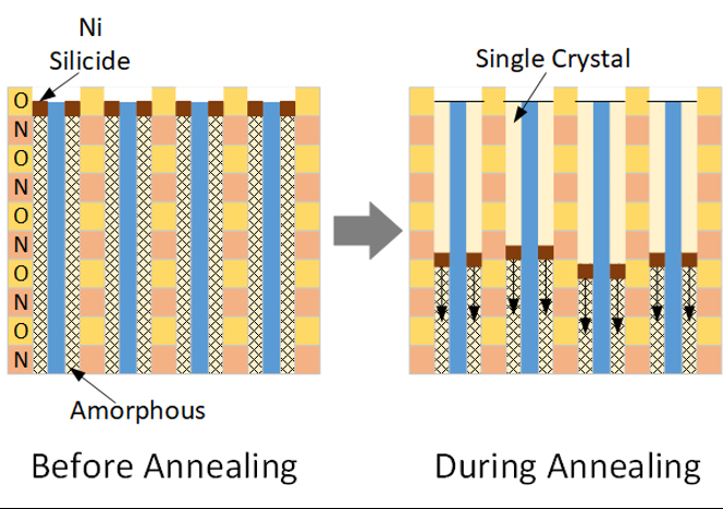 另一种创建这种通道的方法不需要两片晶圆。相反,通道中填充多晶硅,这是传统做法。然而,在退火之前,镍硅化物会沉积在通道上。在退火过程中,该硅化物会从顶部向下浮动,沿途催化结晶。当它到达底部时,其上方的所有东西都是单晶。硅化物仍留在底部,但位线触点位于顶部,因此不会造成问题(假设它留在原位)。