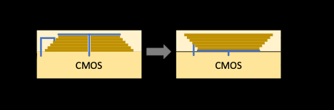 图4:阵列配置下方的CMO。单元结构构建在一个晶圆上,倒置,然后混合键合到包含CMO电路的晶圆上,缩短连接并允许阵列晶圆采用更高温度的工艺步骤。来源:Bryon Moyer/Semiconductor Engineering