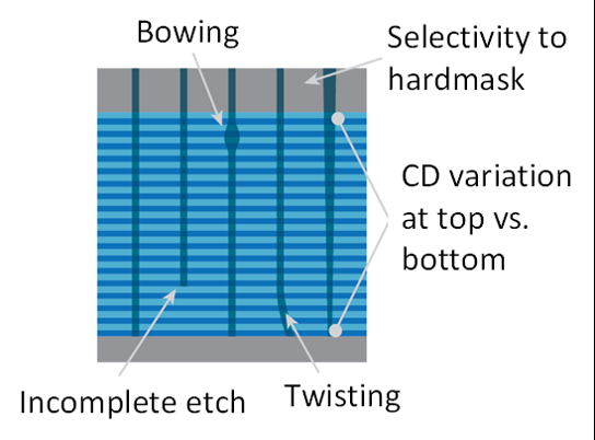 这在蚀刻过程中尤为明显。原本应该是笔直、均匀的柱状物,却可能因不同层上不同的横向蚀刻速率、顶部和底部之间的临界尺寸、蚀刻不完全,甚至柱状物偏离中心而变形。