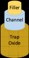 图3:3D NAND的Macaroni结构。电荷存储在陷阱氧化物中,通道形成位线。填充物的作用只是缩小通道以改善栅极控制。来源:Bryon Moyer/Semiconductor Engineering