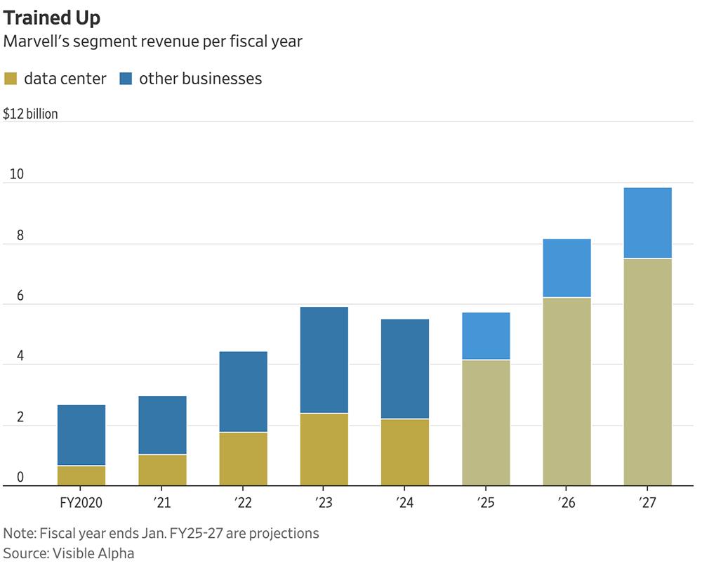 ▲2020~2027财年Marvell主要业务收入分布(图源:《华尔街日报》)
