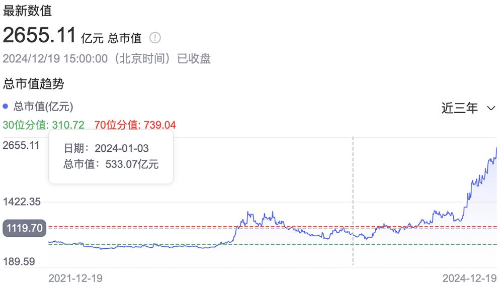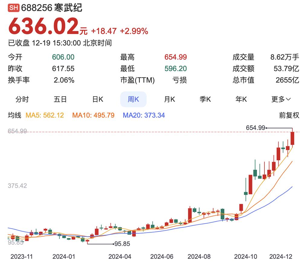 ▲寒武纪2024年股价一路飙涨,总市值超过2600亿元