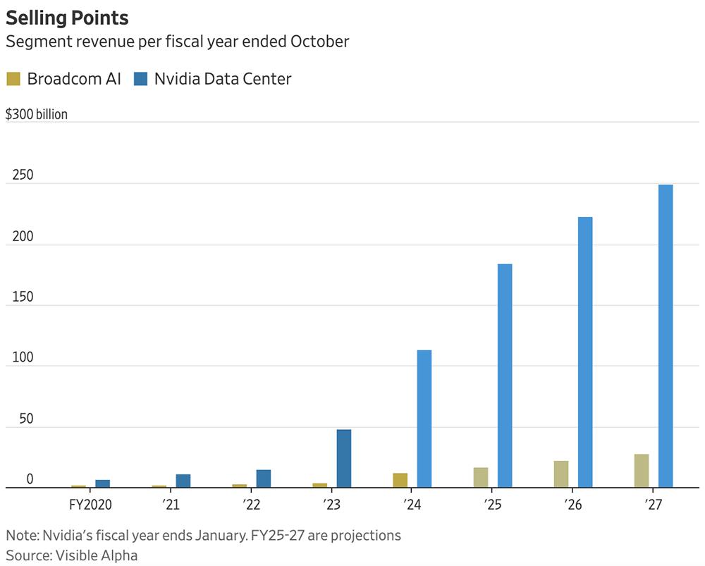 ▲截至10月,博通AI和英伟达数据中心每个财政年度的业务收入(图源:《华尔街日报》)