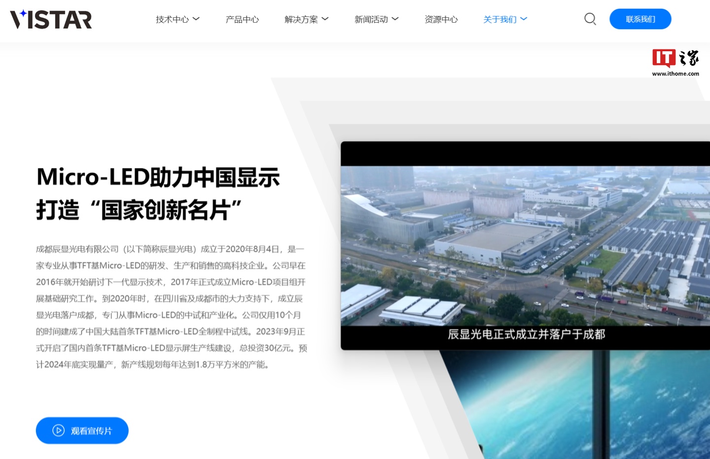 IT之家查询获悉,成都辰显光电有限公司成立于 2020 年 8 月 4 日,是一家专业从事 TFT 基 Micro LED 的研发、生产和销售的企业,其在 2023 年 9 月正式开启了国内首条 TFT 基 Micro LED 显示屏生产线建设,预计 2024 年底实现量产,新产线规划每年达到 1.8 万平方米的产能。