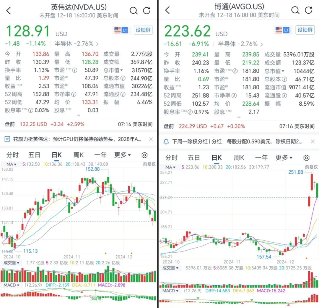 市场也似乎这么认为。比于11月的150美元高点,英伟达的市值在短短一个月内下跌了约3000亿美元,目前已经来了130美元左右的小低谷。钱不会消失,只会流向其他的投资标的,博通在同一时间上涨幅度也与这个数字非常接近。英伟达的面前逐渐勾勒出了一个对手的形象:以博通为代表的ASIC芯片厂商,以及背后支持他们的应用厂商如Open AI和Facebook。