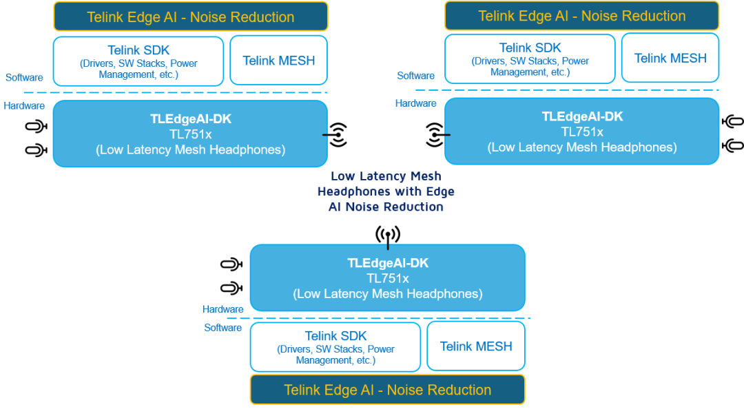 以智能音频为例,在消费音频设备中,TL751X以高性能、多协议和高集成度支持耳机等设备实现优质音频传输,同时借助强大算力为智能语音交互助力,如依语音指令智能切换音频模式;并以低功耗和人工智能降噪算法,精准识别并抑制环境噪音。音频会议系统里,TL751X 处理多路音频,借助人工智能实现高清通话、混音与智能语音指令响应,像自动记录要点等。在多人组网对讲系统中,TL-EdgeAI_751X平台结合自研的低延迟Mesh网络技术和Telink Edge AI-Noise Reduction技术,已经实现了同时多达24人的低延时、高稳定性和高音质的双工通信,推动了智能音频技术在人工智能的加持下不断创新和发展,广泛应用于各个领域。