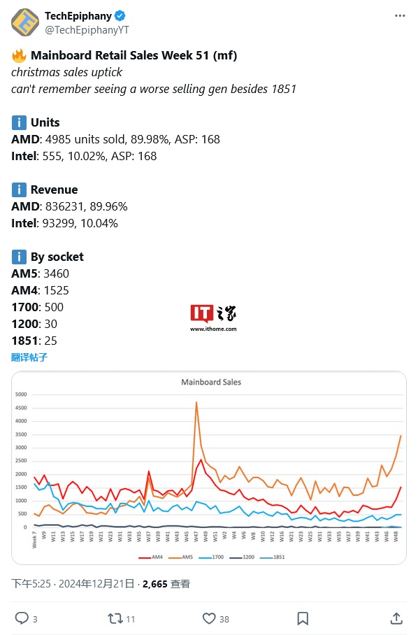 英特尔各平台主板销量总和不足 1000 块,其中最新的 LGA 1851 平台更是仅售出 25 块,与 AMD 形成鲜明对比。