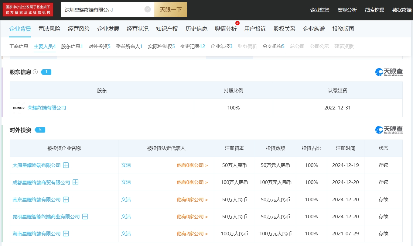 天眼查资料显示,近日,荣耀终端有限公司全资子公司深圳星耀终端有限公司对外新投资4家子公司,分别为太原星耀终端有限公司、成都星耀终端商贸有限公司、南京星耀终端有限公司、昆明星耀智能终端商业有限公司。