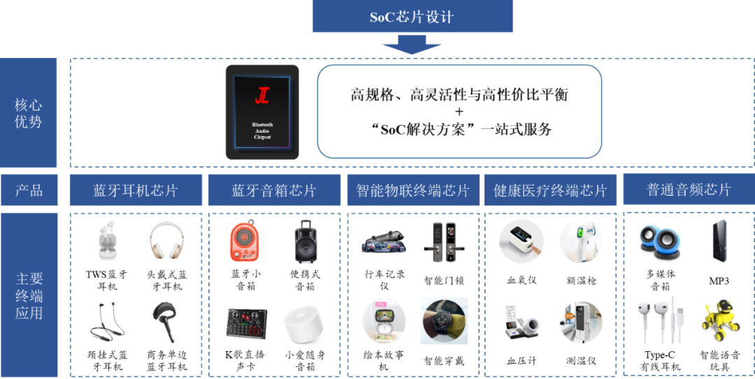 经过十余年的稳步发展,依托显著的产品优势,杰理科技已成为蓝牙音频芯片(包括蓝牙耳机芯片、蓝牙音箱芯片)的主要提供商,亦成为蓝牙音频产品的推广者和普及者,被誉为蓝牙音频界的“国芯之光”。杰理科技产品的大规模应用引领着全球蓝牙音频产品的普及化风潮。与此同时,依托平台化研发优势,杰理科技实现产品线快速拓展及新应用领域快速切入,近年来已成为智能物联终端芯片、健康医疗终端芯片领域的主要市场参与者和竞争者。
