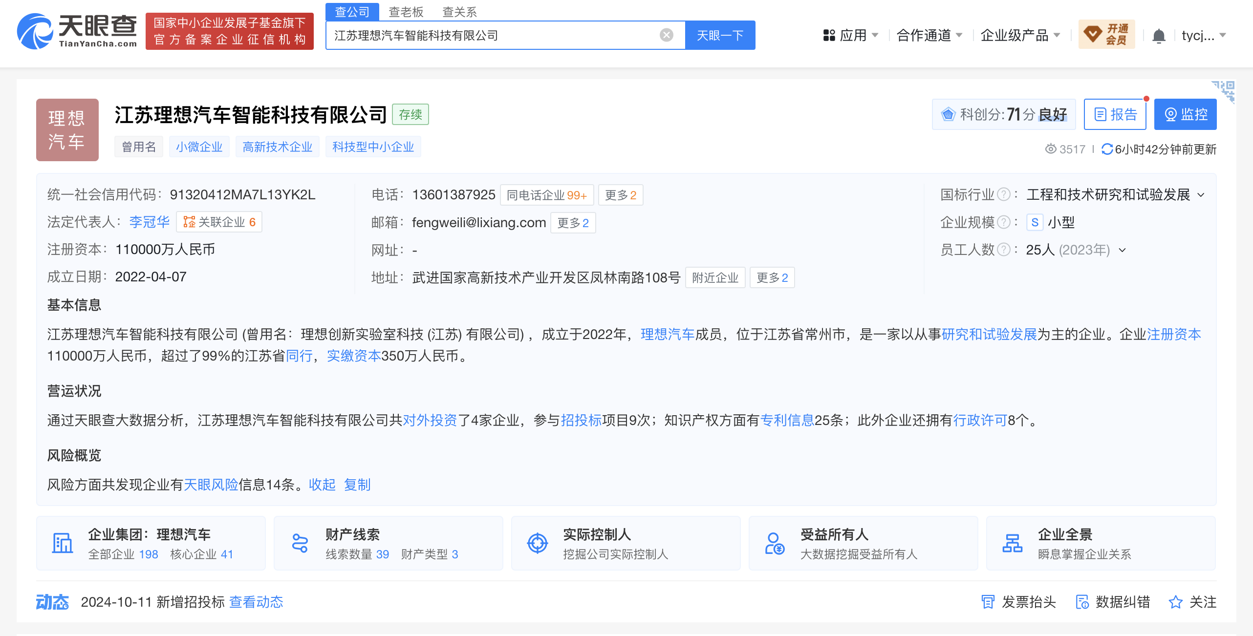 4、理想汽车增加智能科技公司注册资本,由3.3亿元增至11亿元