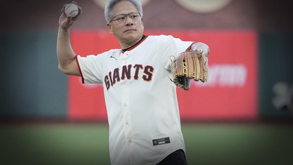 2024年9月3日,黄仁勋在一场棒球比赛之前参与开球仪式