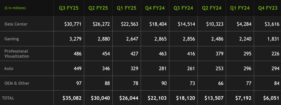 2023财年一季度,英伟达数据中心业务首次超越游戏业务,此后持续被拉大,目前数据中心业务营收贡献接近90%