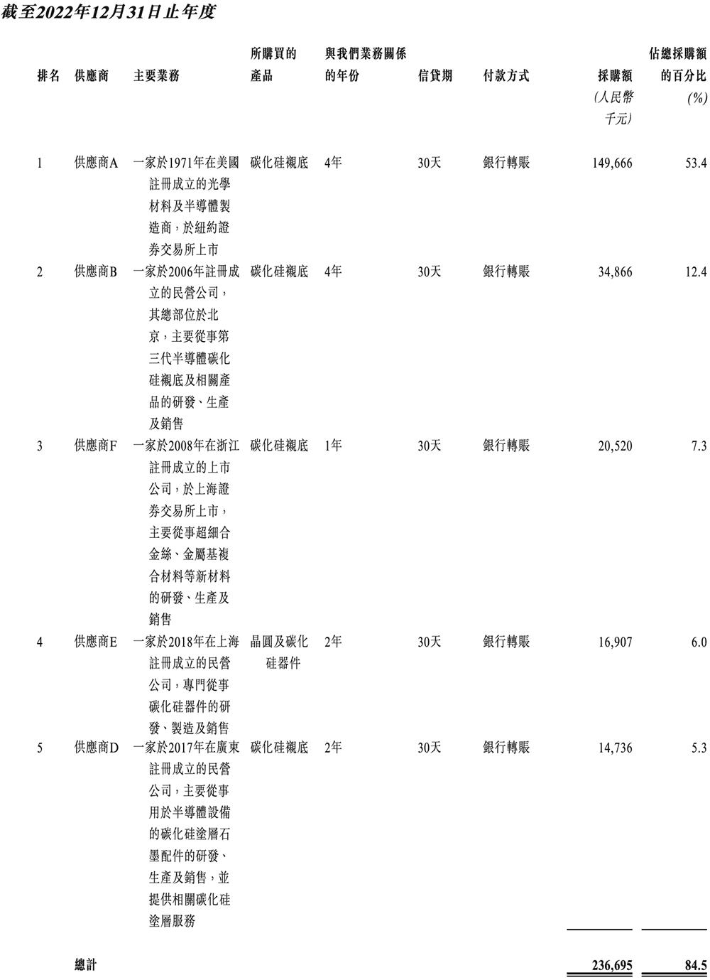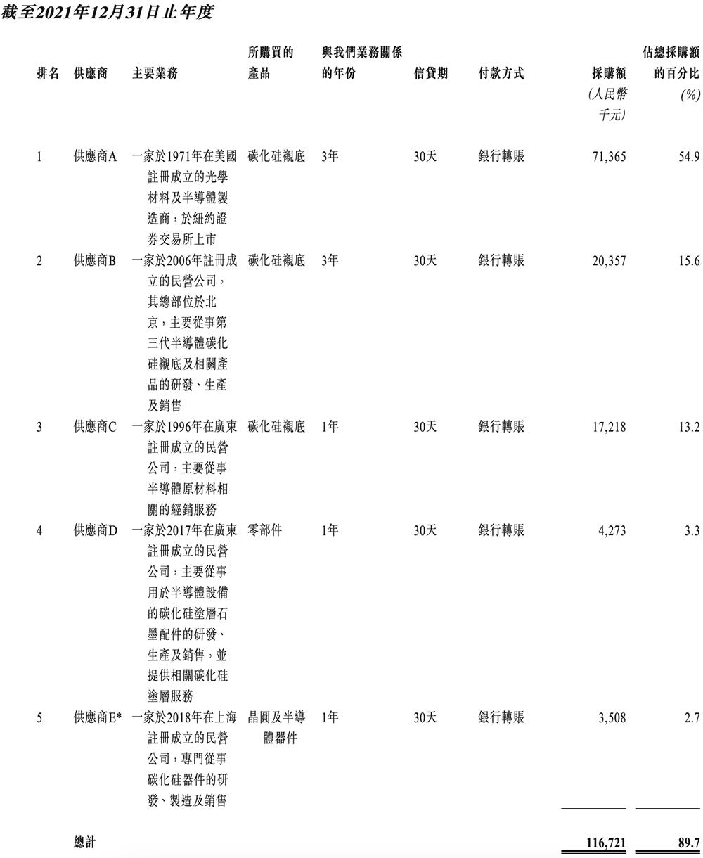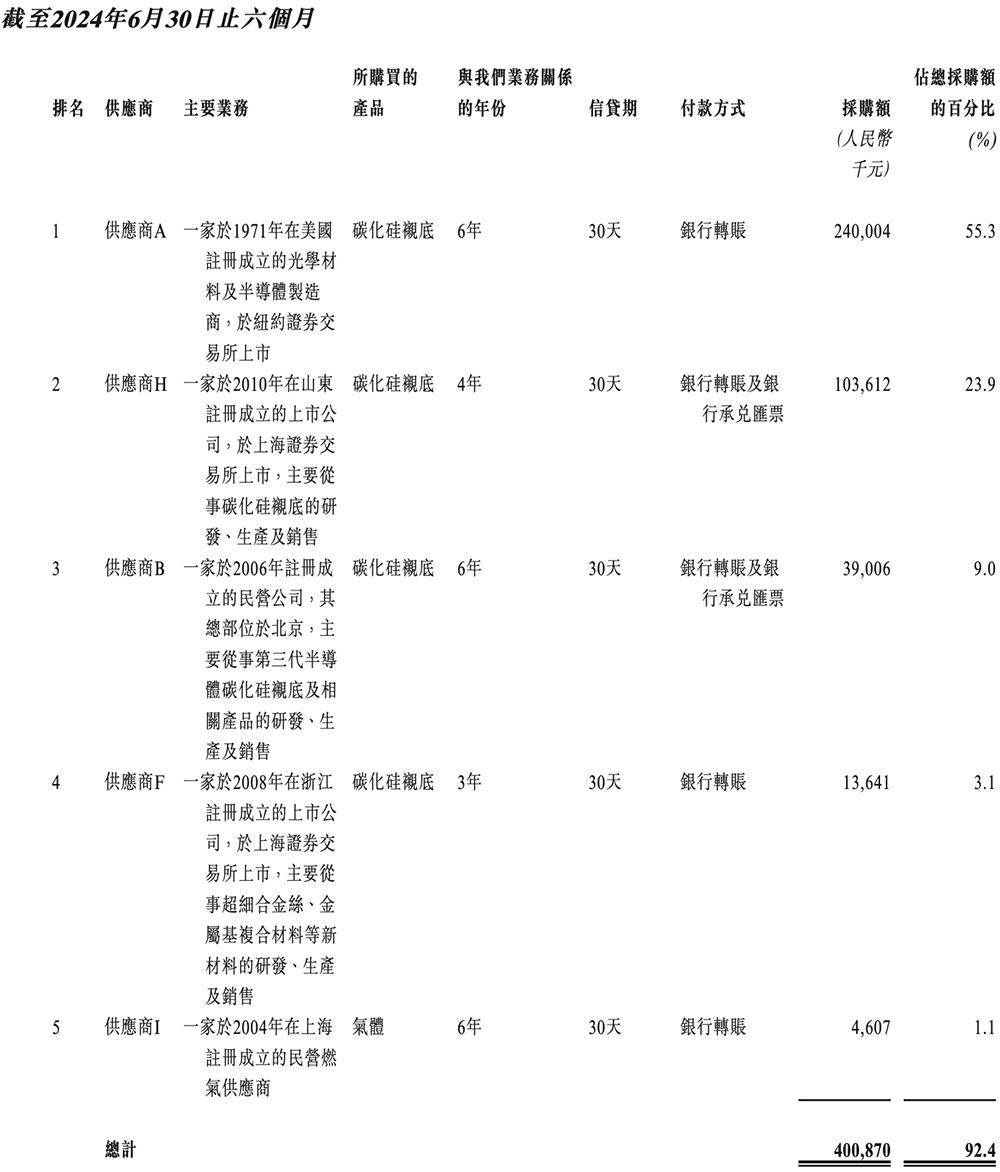 天域半导体向供应商采购生产碳化硅外延片的各种原材料,包括导电型碳化硅衬底及其他辅助材料,例如石墨备件、化学品、包装材料及特种气体。
