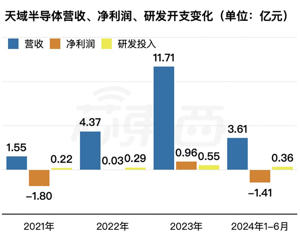 2021年~2024年上半年天域半导体营收、净利润、研发开支变化(单位:亿元,芯东西制图)