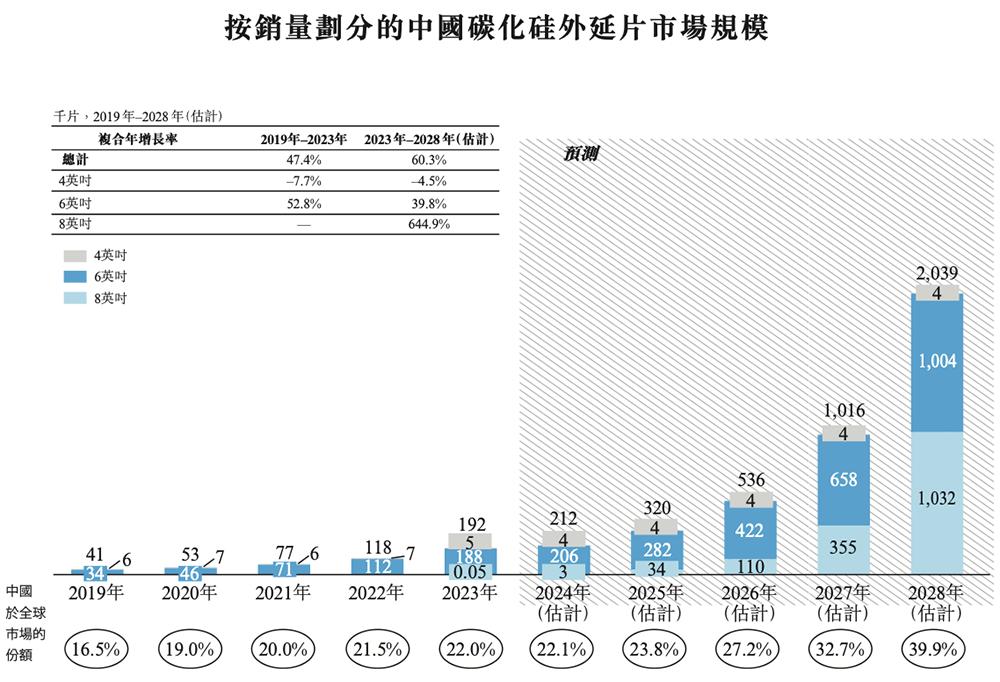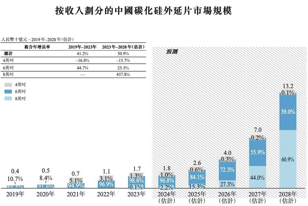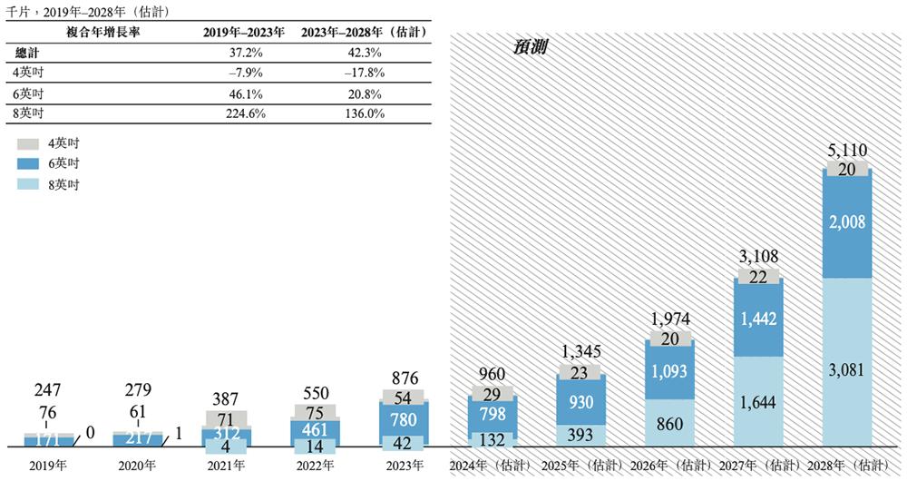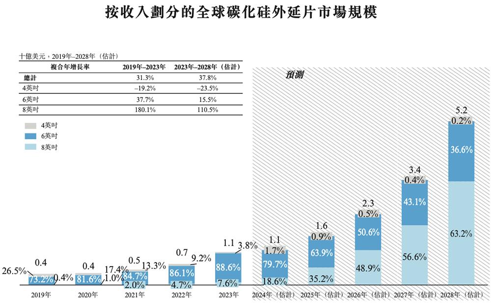 弗若斯特沙利文报告显示,全球碳化硅外延片市场中,8英寸外延片虽然起点较低,但增势良好,收入从2023年的1亿美元增至2028年的预计33亿美元。