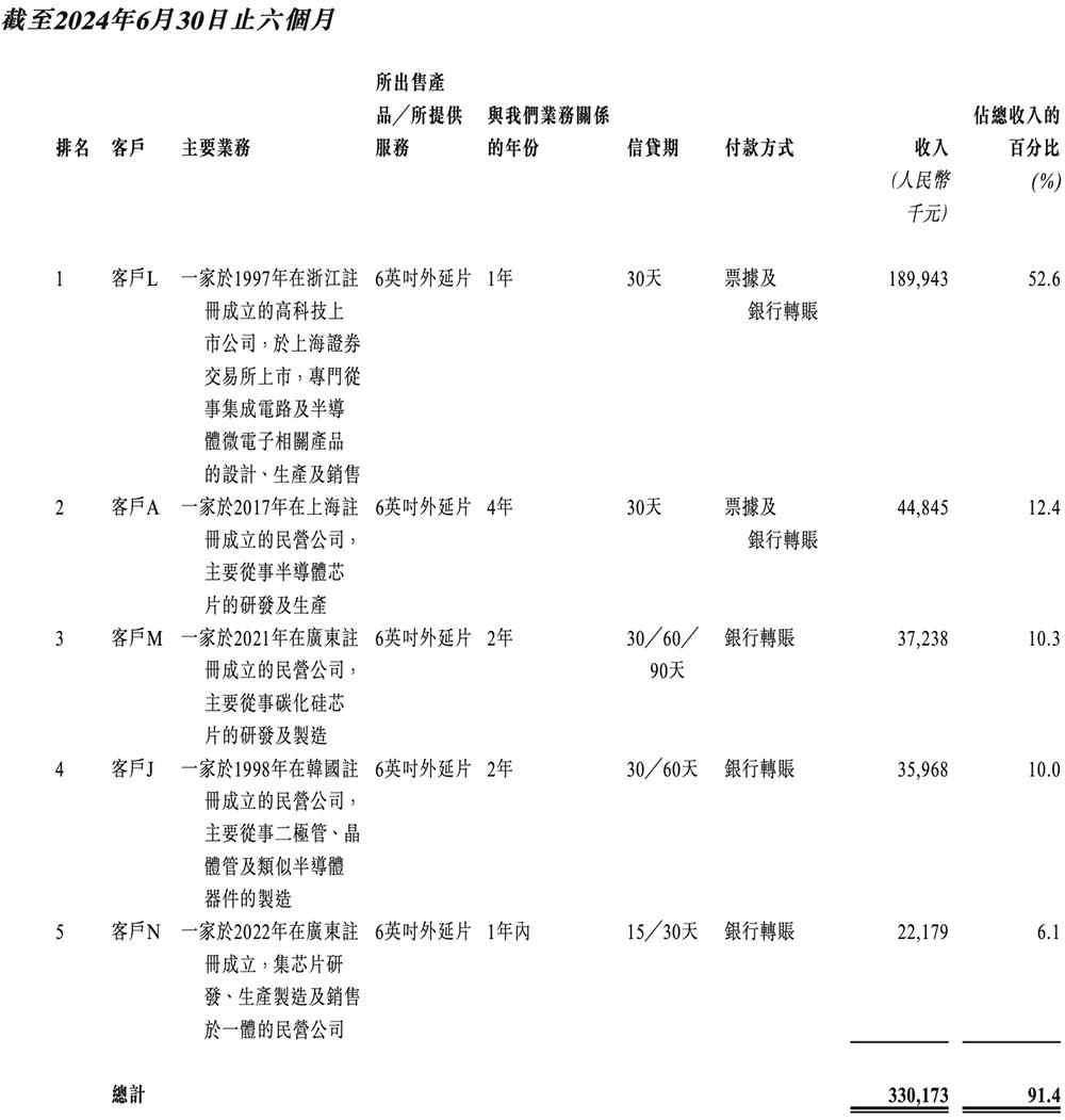 2021年、2022年、2023年、2024年上半年,其五大客户贡献的收入分别占总收入的73.5%、61.5%、77.2%、91.4%;最大客户贡献的收入分别占总收入的30.9%、21.1%、42.0%、52.6%。
