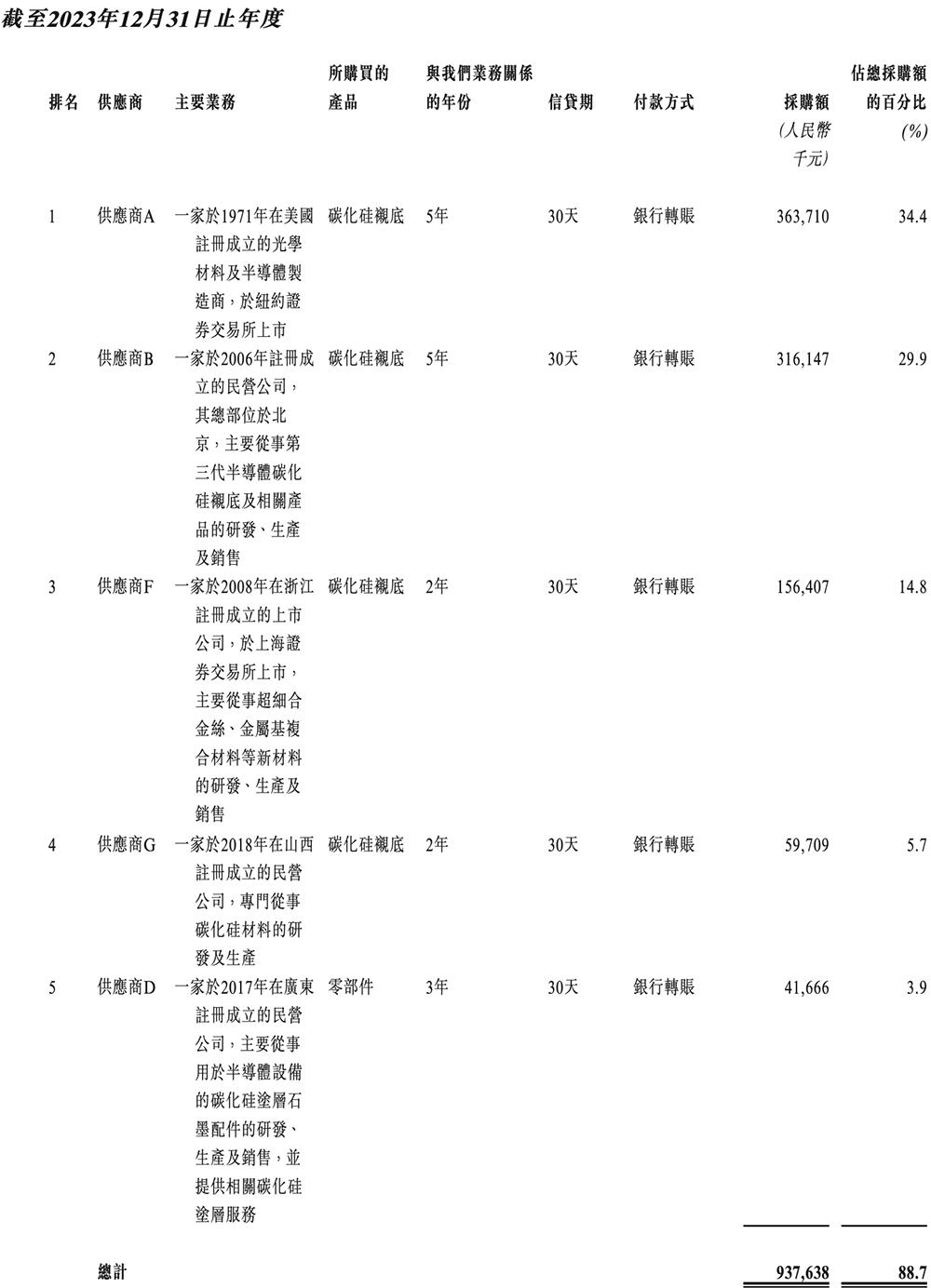 2021年、2022年、2023年、2024年上半年,天域半导体向五大供应商的采购额分别为1.17亿元、2.37亿元、9.38亿元、4.01亿元,分别占同年/期总采购额的89.7%、84.5%、88.7%、92.4%。