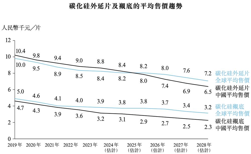 年度全球及中国碳化硅外延片及衬底的平均售价趋势如下图所示: