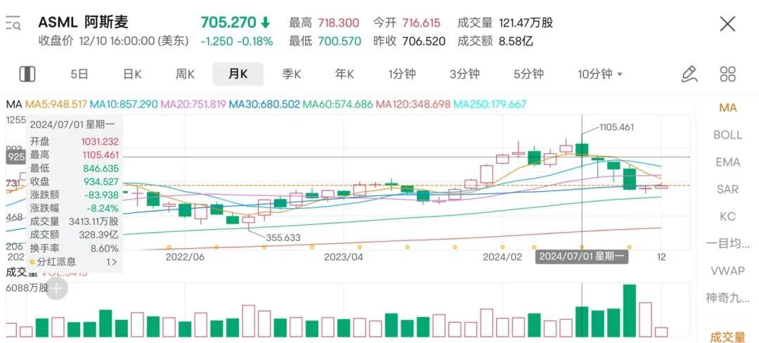 阿斯麦近期的财务数据其实已经给出了答案。在美股2024年的大牛市中,阿斯麦成为今年表现最差的科技公司。