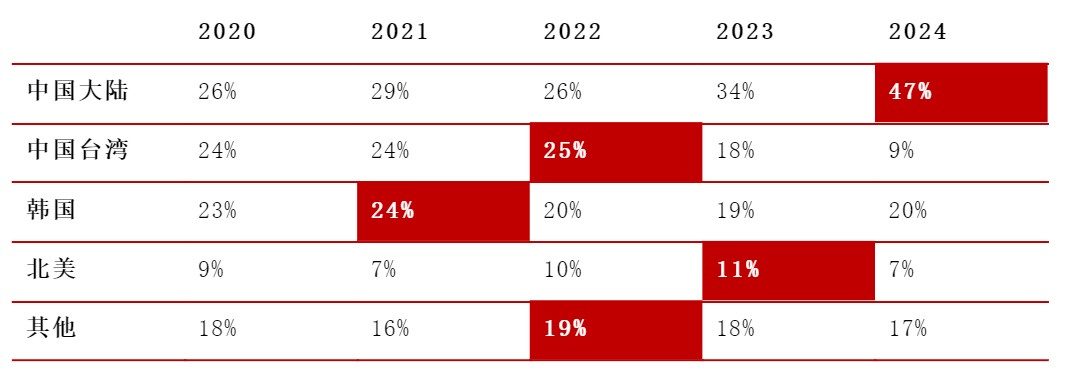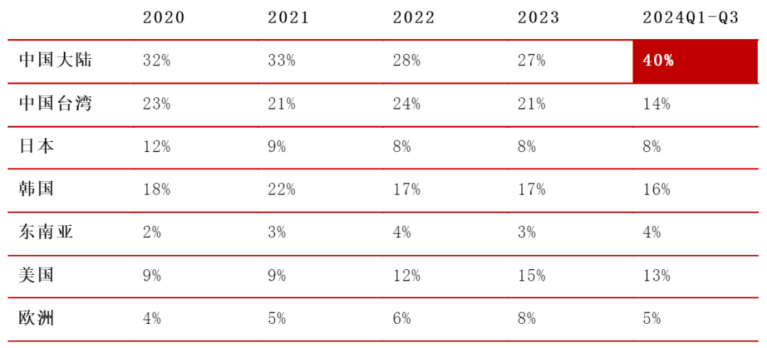 图:应用材料近5个财年按地区收入分布,大陆地区位列第一,并于2024财年前三季度实现40%的占比, 资料来源:公司公告,东吴证券