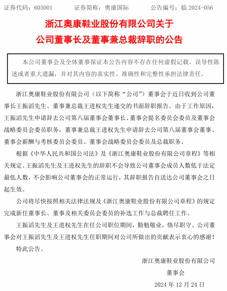 同日,奥康国际发布关于公司董事长及董事兼总裁辞职的公告,由于工作原因,王振滔申请辞去公司第八届董事会董事长、董事会提名委员会委员及董事会战略委员会委员职务,董事兼总裁王进权申请辞去公司第八届董事会董事、董事会薪酬与考核委员会委员、董事会战略委员会委员及总裁职务。