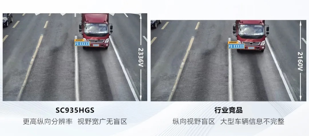 SC935HGS采用了3840Hx2336V的分辨率比例,其纵向分辨率较市场同类型竞品更高,能够在纵向上为ITS摄像头提供更佳视野,减少拍摄车身高度较高的大型车辆时纵向拍摄盲区的产生,让ITS车道监测视野更清晰、完整、无死角。SC635HGS则采用了2880Hx2160V的分辨率比例,可灵活应用于双车道等小型路段的ITS监测,满足不同应用需求。