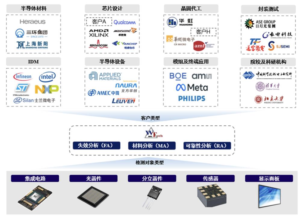 胜科纳米主要采用以销定产的生产模式,实行订单式生产。目前该公司已掌握多类型产品的检测分析能力,累计服务全球客户2000余家,客户类型覆盖半导体领域全产业链,客户群体包括芯片设计、晶圆代工、封装测试、IDM、原材料、设备厂商、模组及终端应用客户、科研机构及院校等。