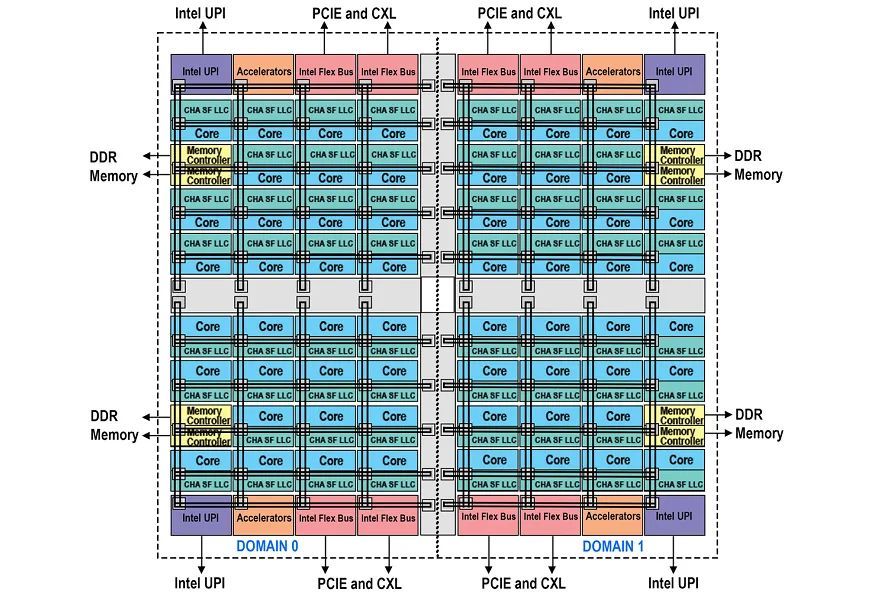 第五代至强可扩展处理器是2颗芯粒,可以划分为两个SNC域。