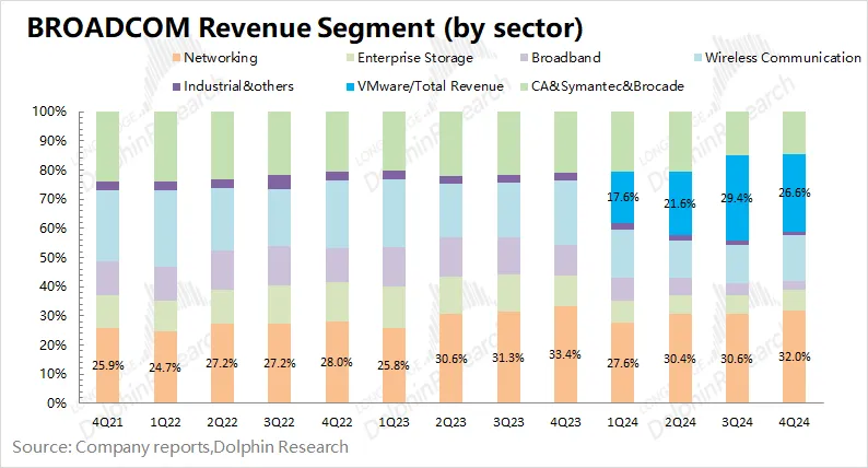 根据细分领域来看,半导体解决方案中的网络业务和基础设施软件是现在博通占比最大的两个业务,加起来占比近60%。根据海豚投研整理汇总,网络芯片大概包括: 以太网交换芯片、路由芯片、ASIC定制化芯片、PHY芯片(光、铜)、光纤发射器与接收器 。