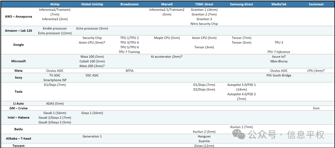 公众号信息平权统计,目前其实所有正在发展AI的巨头都在投入研发ASIC,只是所处阶段各有不同而已。