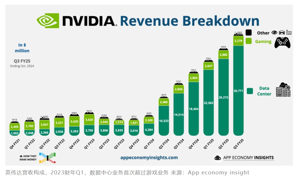 一方面,截至到今年10月27日的第三财季,过去四年,英伟达的数据中心业务增长了约30倍,财季营收从11亿美元(占比25%)暴增到309亿美元(占比88%)。
