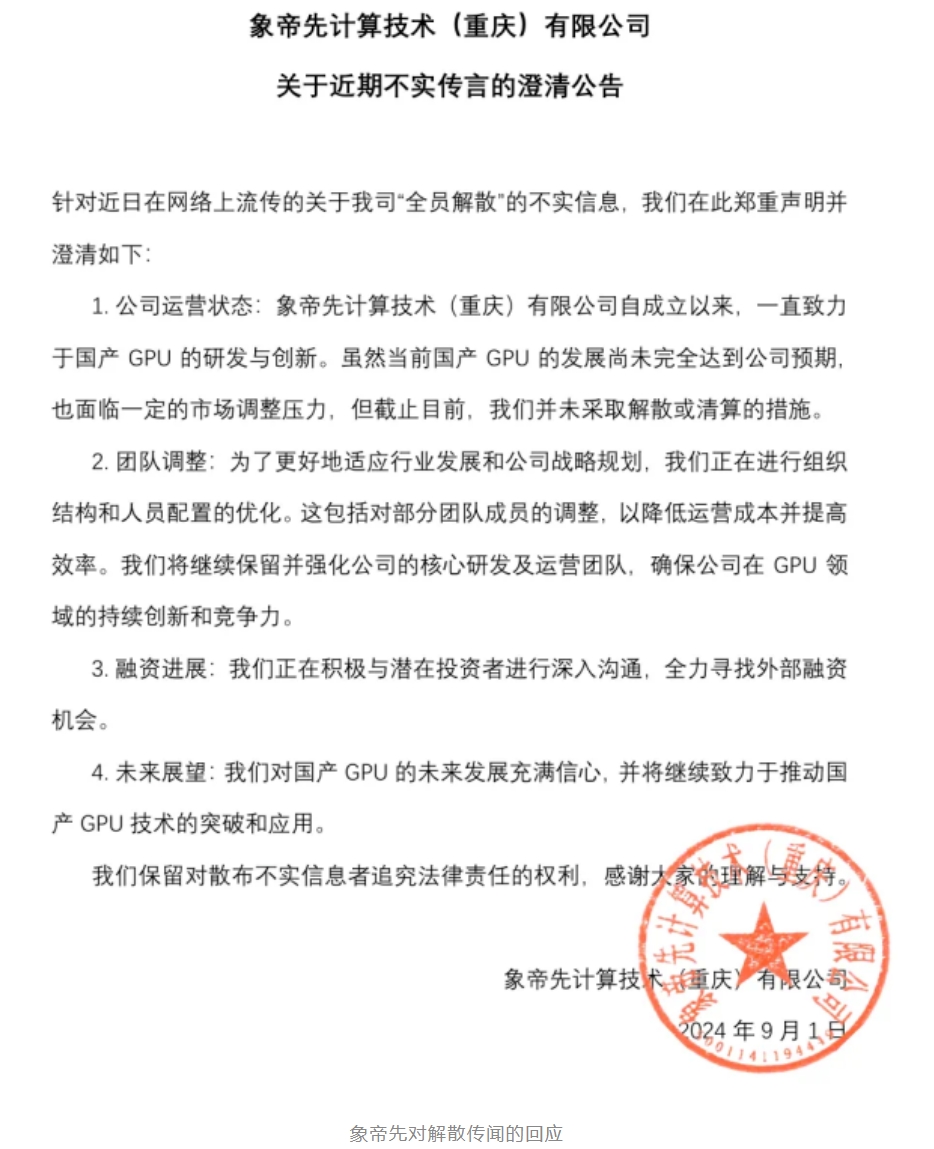 针对解散传闻,象帝先发文回应称未解散、清算,只是通过人员优化降低成本,并且会保留核心研发团队,并且正在积极与投资者沟通,寻找外部融资。