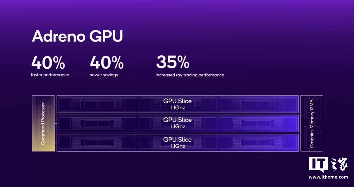 作为参考,高通骁龙 8 至尊版发布于今年 10 月,采用台积电 N3E 工艺;搭载 Adreno 830 GPU,峰值性能提升 44%,能效提升 25%,频率 1100MHz ,具备 12M 独立缓存。