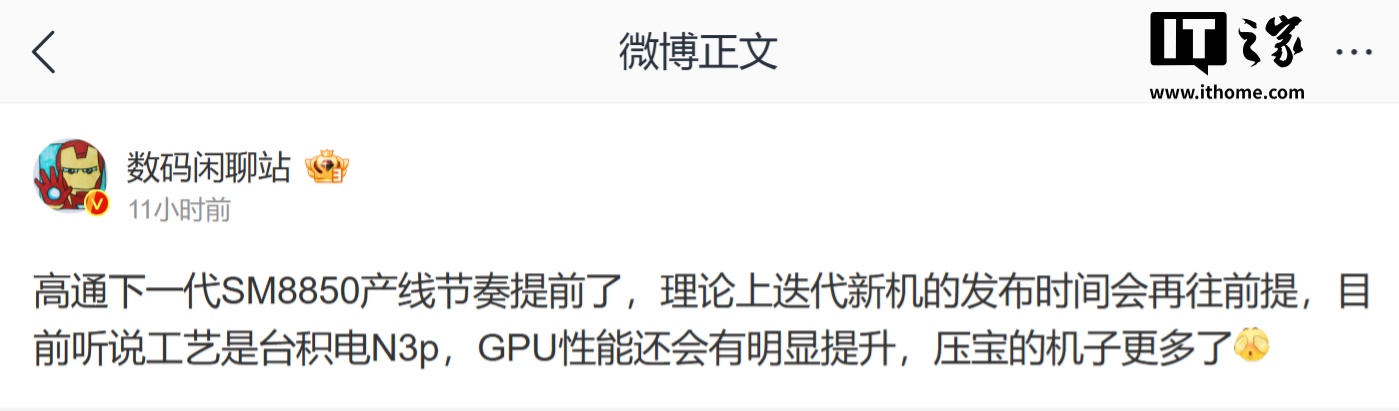 IT之家注:SM8750 为高通骁龙 8 至尊版(8 Elite),预计 SM8850 为第二代骁龙 8 至尊版。