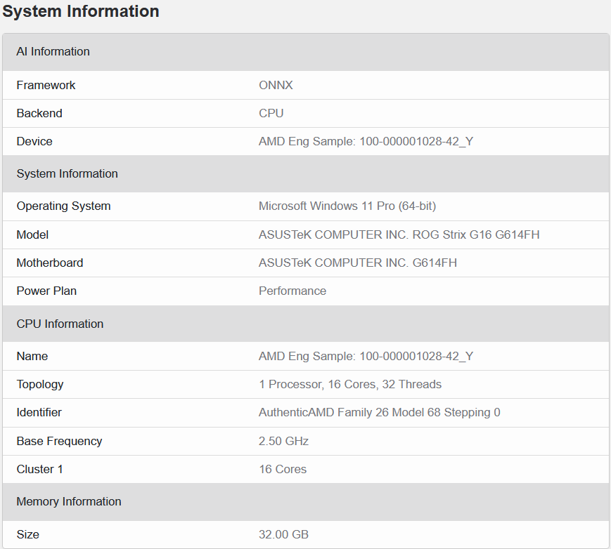 Geekbench测试显示,这款据称基于Zen 5的Fire Range CPU拥有16核32线程,基础频率为2.5 GHz。若AMD未改变命名方案,该SKU或命名为Ryzen 9 9955HX,但这也仅是猜测。代号为“G614FH”的Asus ROG Strix G16配备了这款未发布的Fire Range CPU及32GB DDR5内存,对于游戏和生产力任务而言应已足够。我们期待看到这款处理器与英特尔Arrow Lake-HX芯片的竞争表现。
