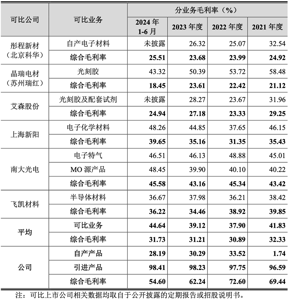 2021 年,其自产产品尚处于产能爬坡阶段,收入规模较小,单位成本较高,因此恒坤新材的毛利率明显低于同行业上市公司可比业务平均水平。2022 年以来,随着自产产品收入不断提升,其毛利率呈上升趋势,处于同行业上市公司可比业务毛利率中间水平。