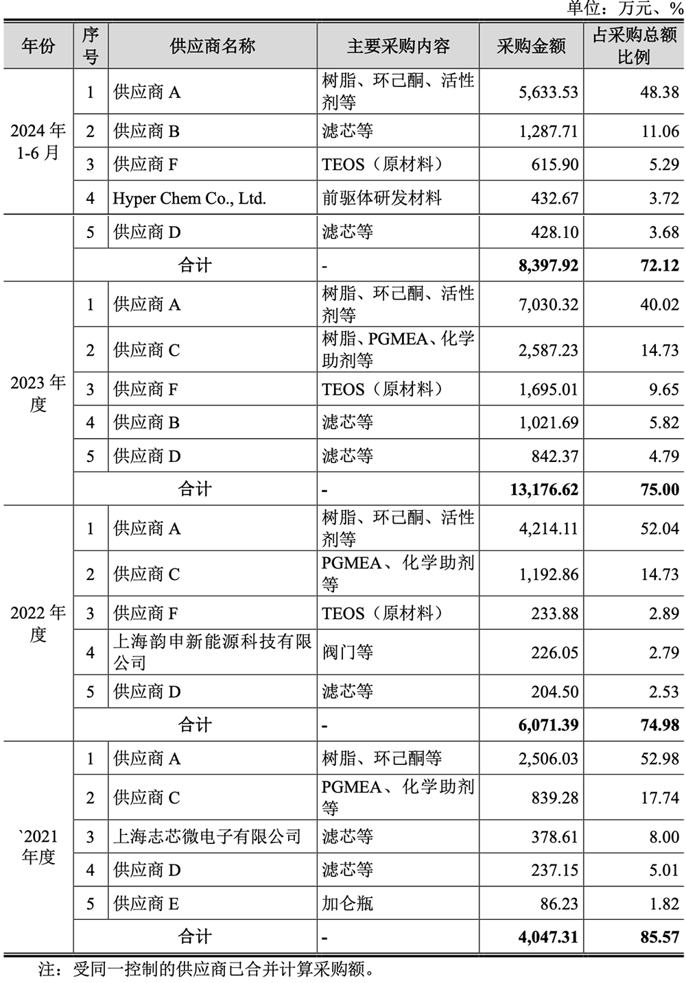 供应上,恒坤新材产品所需的原材料主要为树脂、添加剂、溶剂以及其他辅料耗材等,所需的设备主要为光刻机、缺陷扫描仪等检测设备,光刻材料和前驱体材料生产设备等。