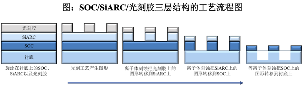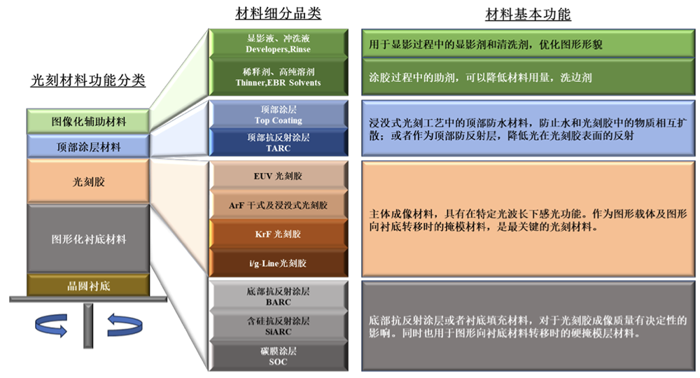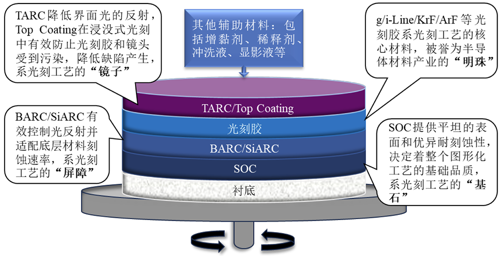 光刻材料主要包括 SOC(Spin On Carbon)、ARC(Anti-reflective Coating)、光刻胶、 Top Coating、稀释剂、冲洗液、显影液等,系光刻工艺中重要材料之一,决定着晶圆工艺图形的精密程度与产品良率。
