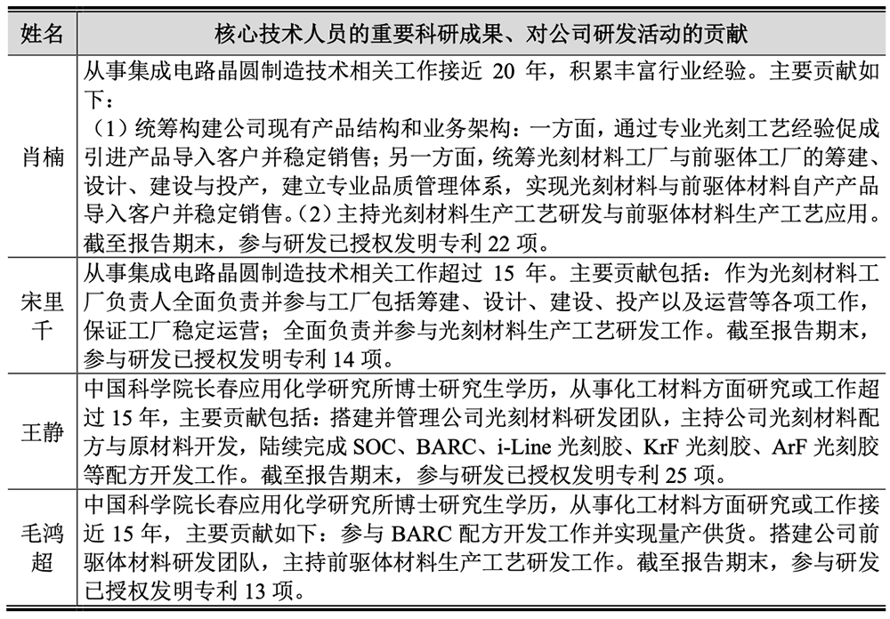 其中肖楠曾在中芯国际、大连英特尔做过工程师,宋里千曾在中芯国际、联华电子担任资深光刻工艺工程师。王静、毛鸿超均为中国科学院长春应用化学研究所有机化学博士。