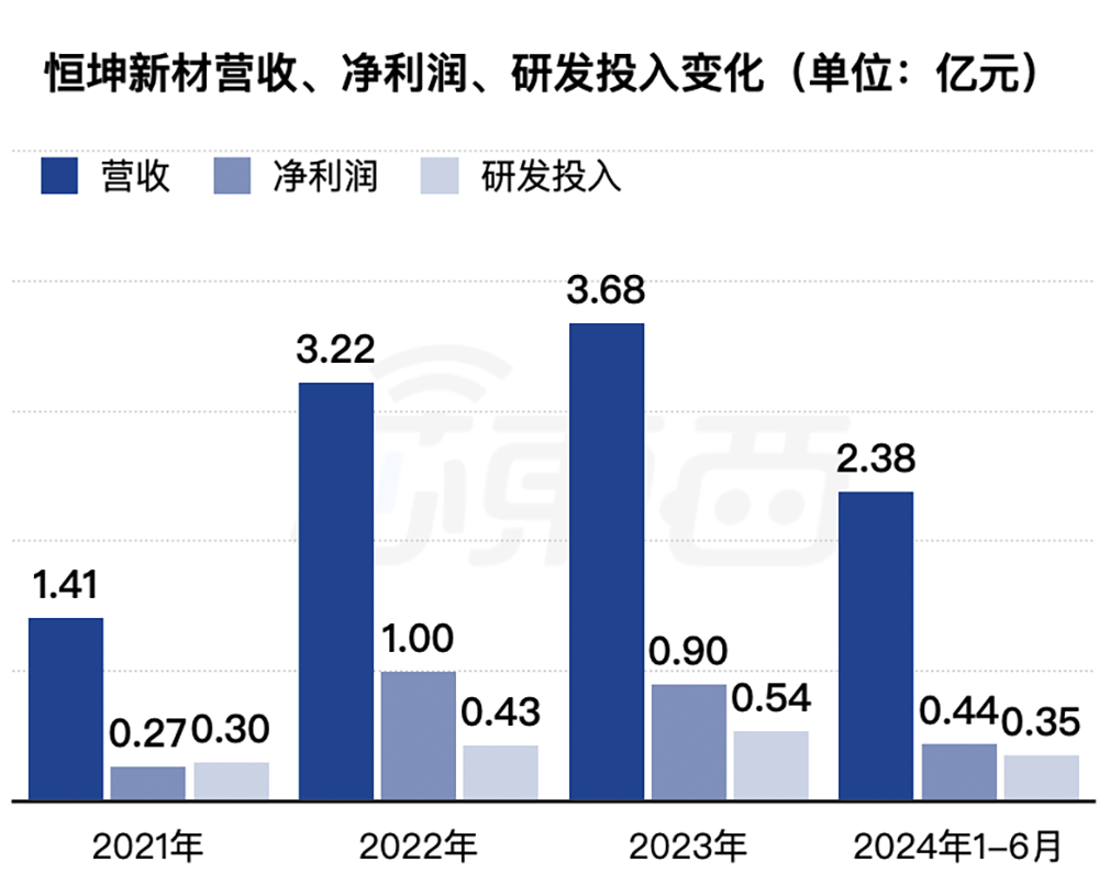 2021 年~2024 年上半年,恒坤新材的累计营收超过 10 亿元,累计净利润约 2.6 亿元,累计研发投入约 1.62 亿元。