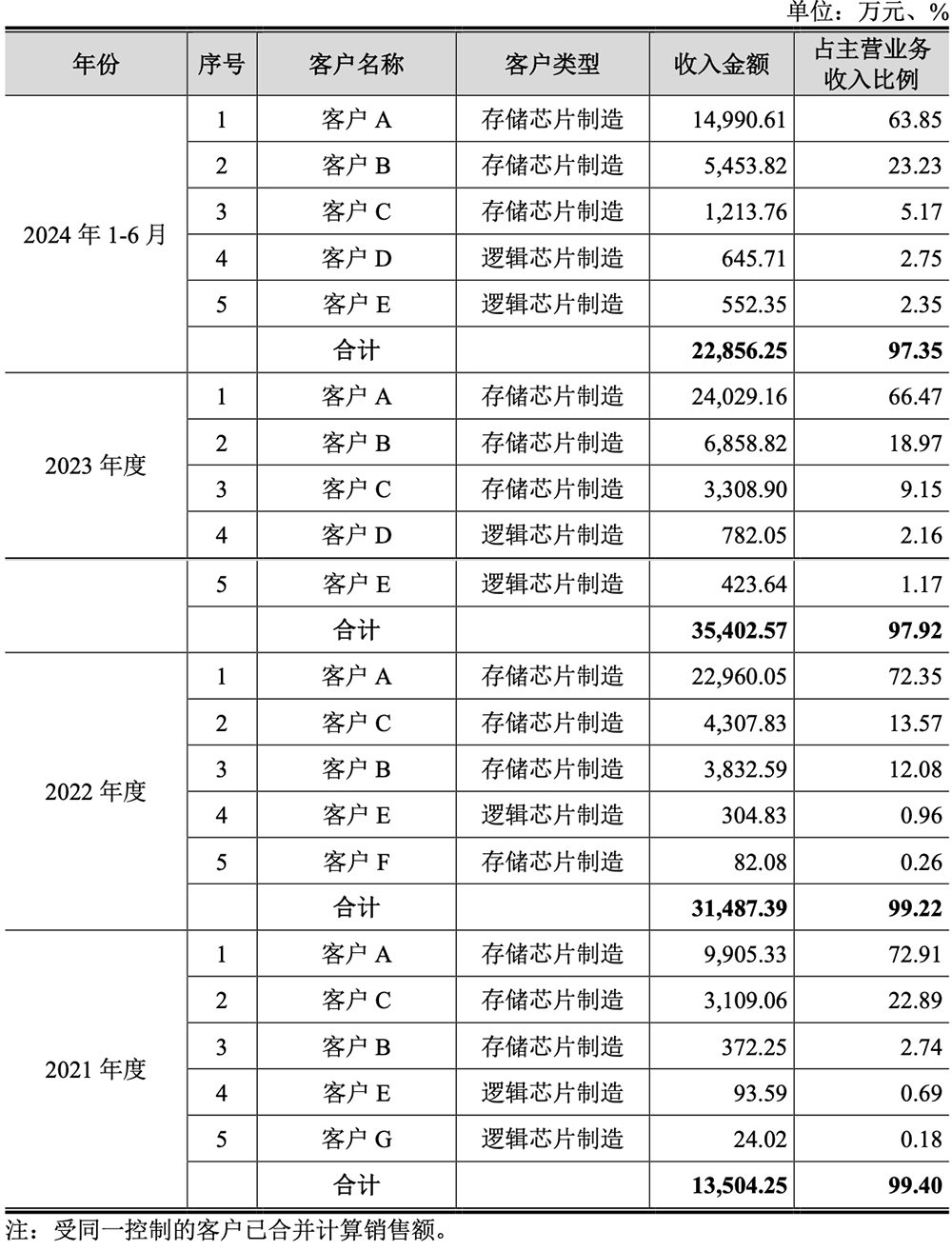 客户集中度较高,主要是由于下游晶圆制造行业集中度较高所致。其主要客户中,客户 A、客户 B、客户 C 均为知名存储芯片制造厂商,客户 D、客户 E 等均为知名逻辑芯片生产厂商。