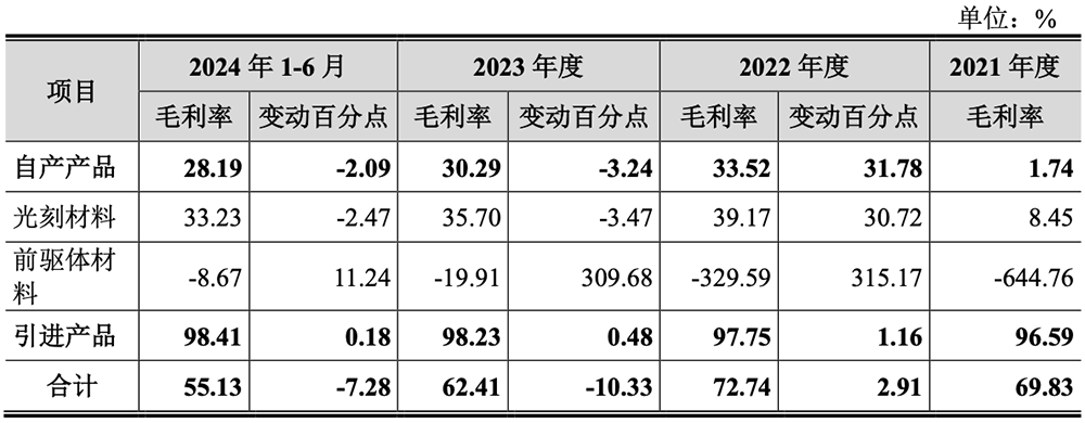报告期内,恒坤新材自产前驱体材料毛利率分别为-644.76%、-329.59%、-19.91%、-8.67%,毛利率持续上升但仍为负值,主要是因为产品处于市场推广期,产量较低,单位固定成本较高。