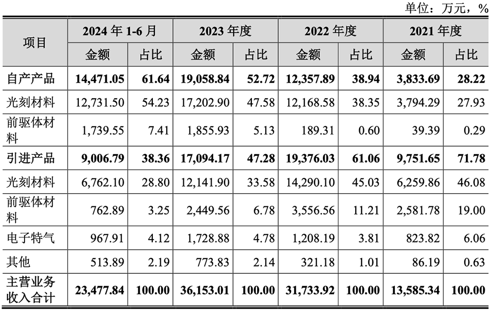 自 2020 年以来,其自产光刻材料与前驱体材料陆续通过多家客户验证并实现销售,并在 2022 年实现自产产品销售收入突破亿元。