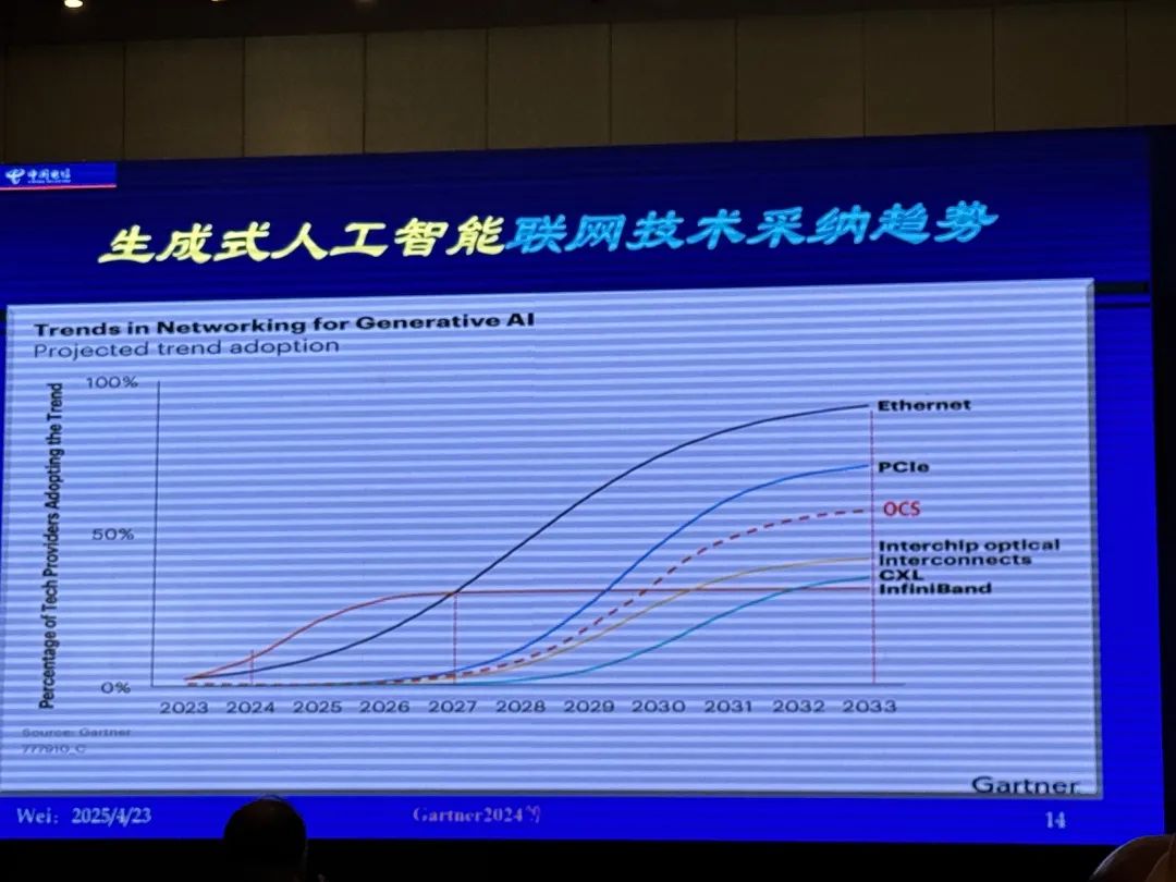 韦乐平表示,生成式人工智能的联网技术主要包括以太网、IB(InfiniBand)、芯片光互连、PCIe、CXL(计算机快速链路)、OCS(光纤交换)等。