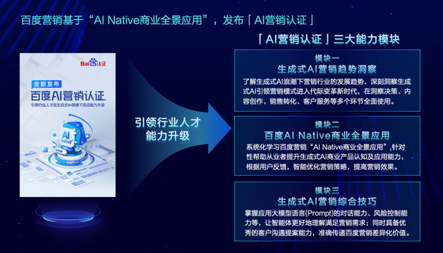 比如百度世界2023上,百度商业生态体系化发布“AI Native商业全景应用”,从品牌到内容,再到效果与经营,重构营销全链路。